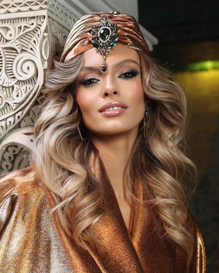 An Alina London turban crafted in holographic jacquard, woven to create depth, texture, and a subtle metallic sheen. Sculpted into a classic turban silhouette, the design offers structure with a refined, contemporary finish.