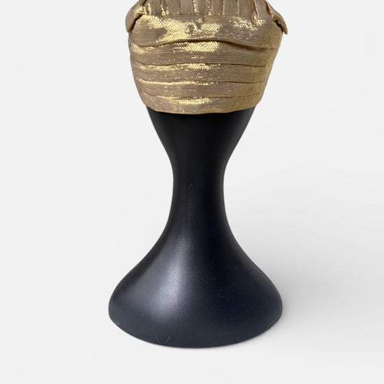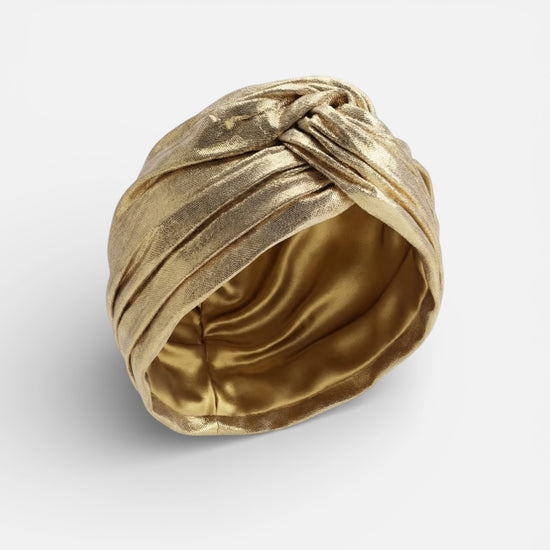An Alina London turban crafted in metallic lamé, shaped for a smooth and elegant fit with a softly luminous finish. Fully lined in pure silk for comfort, the design balances understated glamour with timeless sophistication.