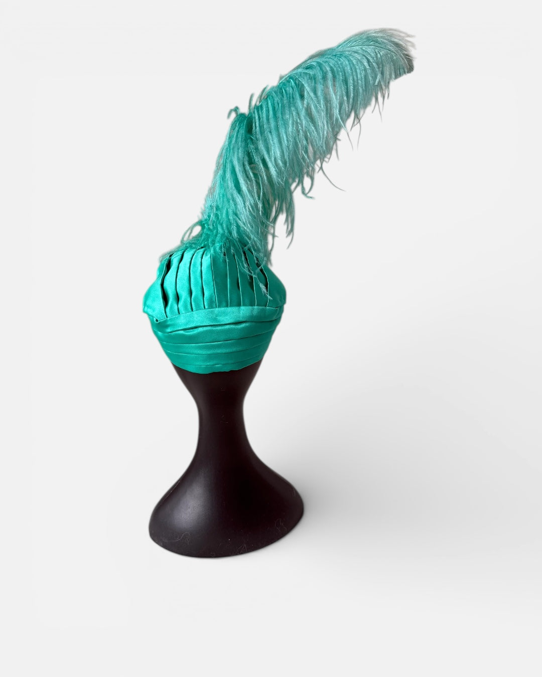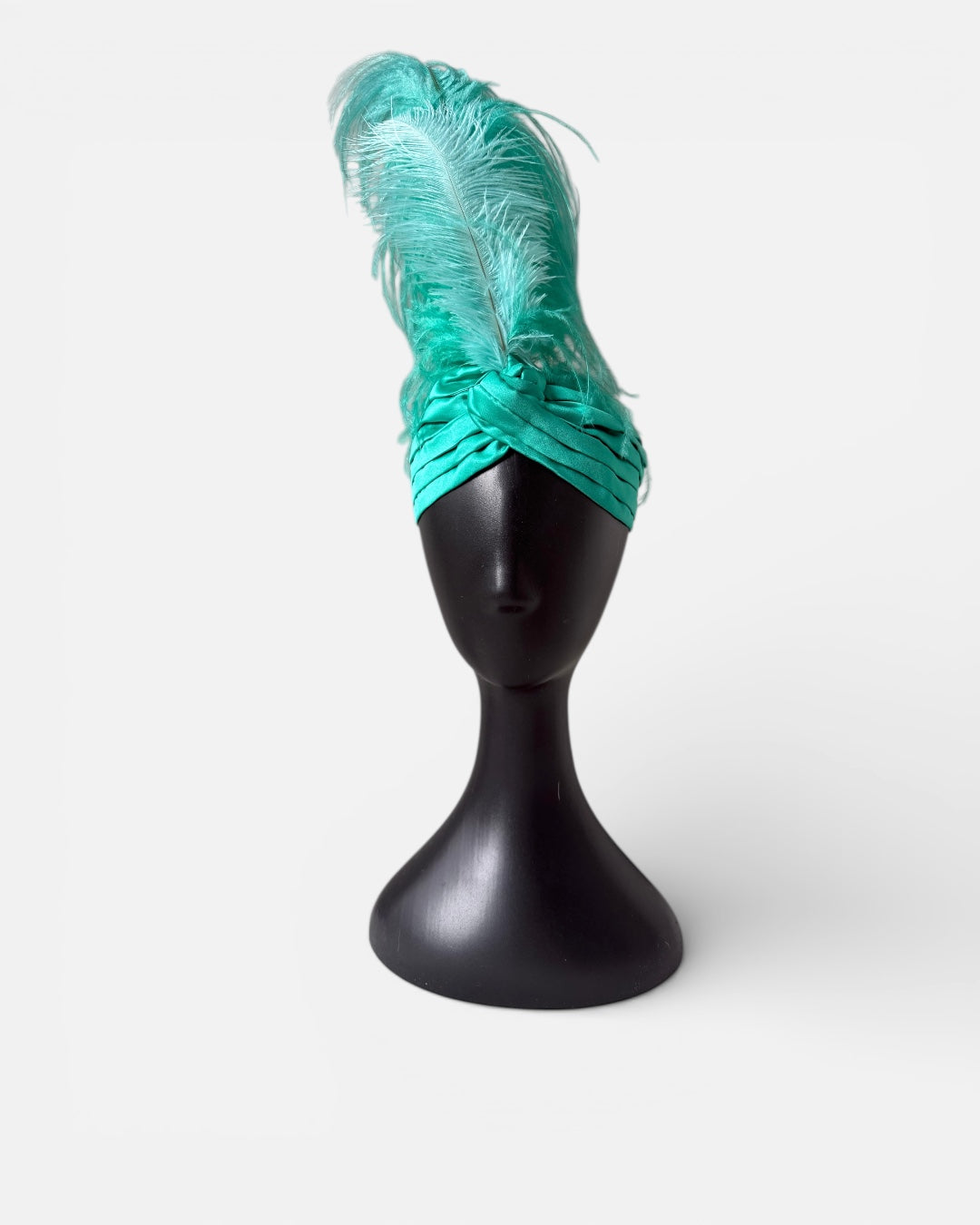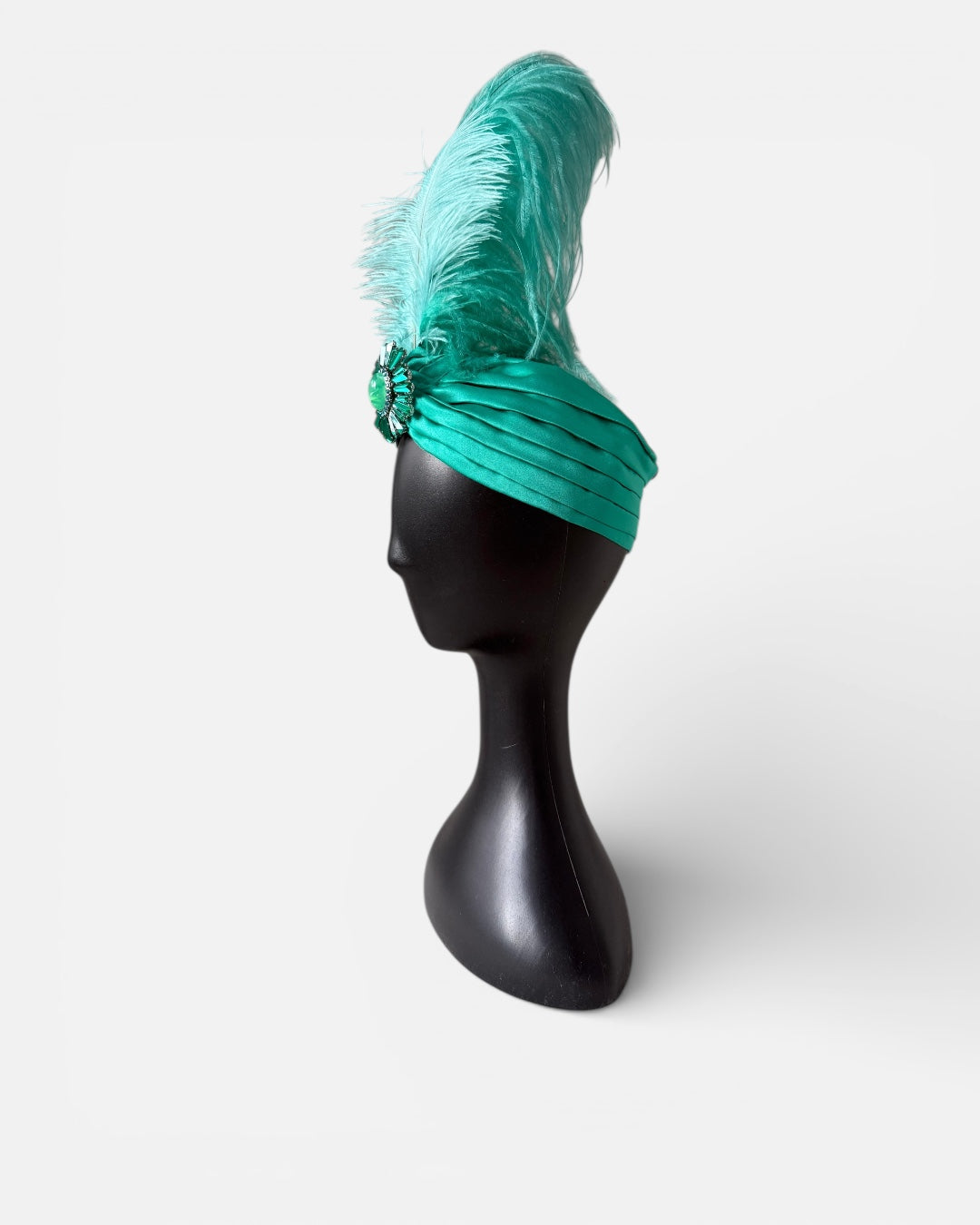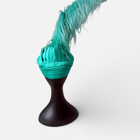 An Alina London statement turban crafted in Mikado satin, sculpted for a structured and elegant silhouette. Fully lined in pure silk for comfort, the design is crowned with a dramatic ostrich feather plume and finished with a decorative brooch for refined impact.