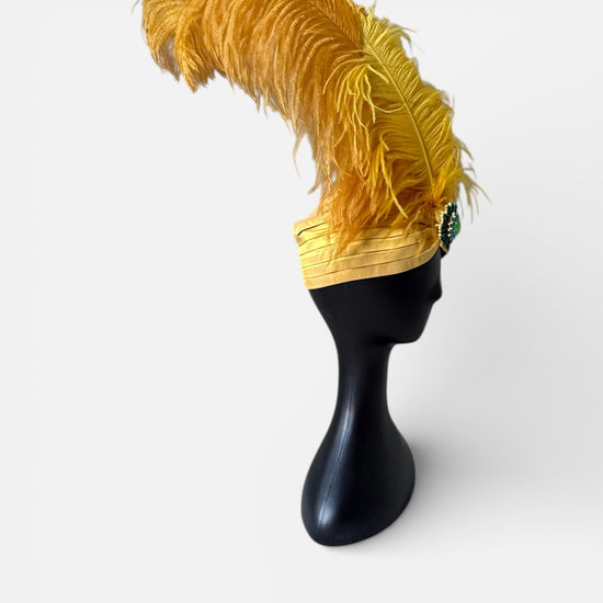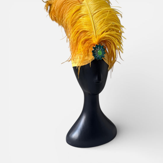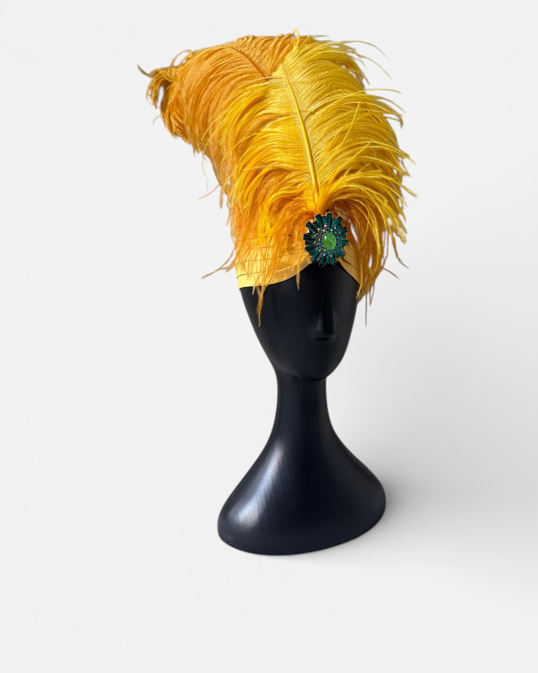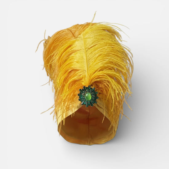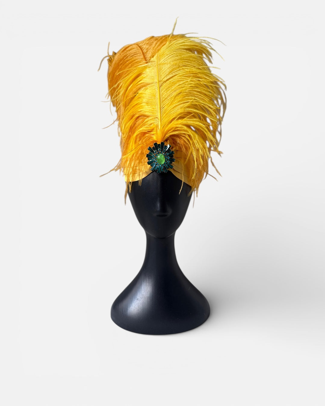 An Alina London statement turban crafted in pure silk taffeta, sculpted for structure and luminous sheen. Fully lined in silk for comfort, the design is crowned with a dramatic ostrich feather plume, creating height, movement, and unmistakable presence. Finished with a decorative brooch, the turban balances bold expression with refined craftsmanship.