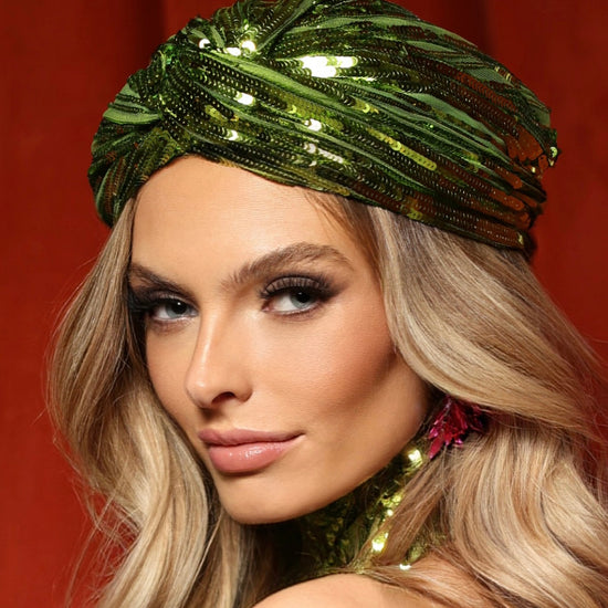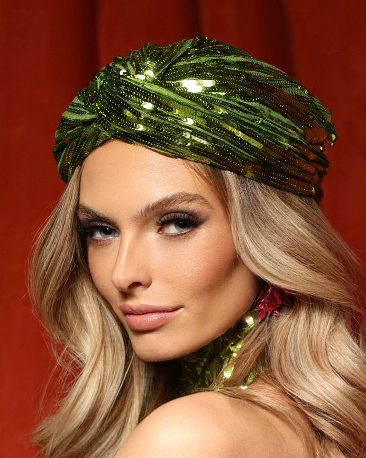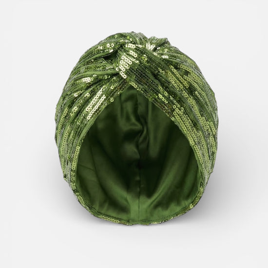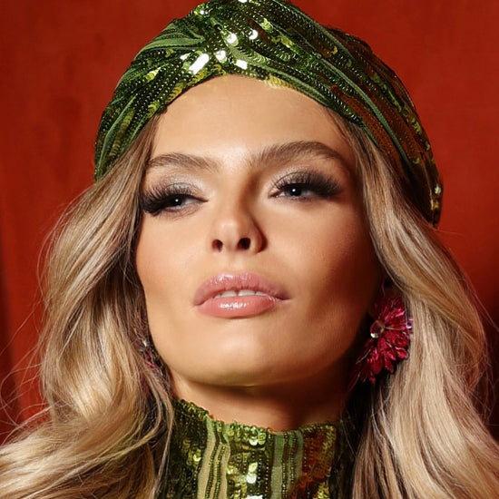 An Alina London sequinned turban crafted in light-catching stretch tulle, sculpted for a refined and elegant silhouette. Fully lined in pure silk for comfort and structure, each piece is designed to sit smoothly and securely, offering understated glamour with a couture finish.