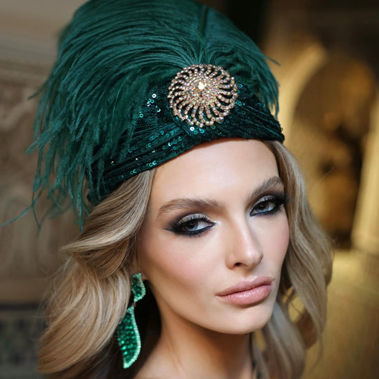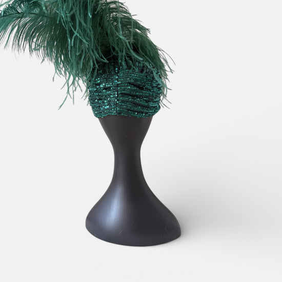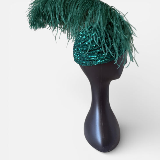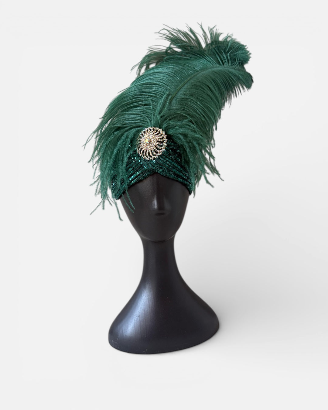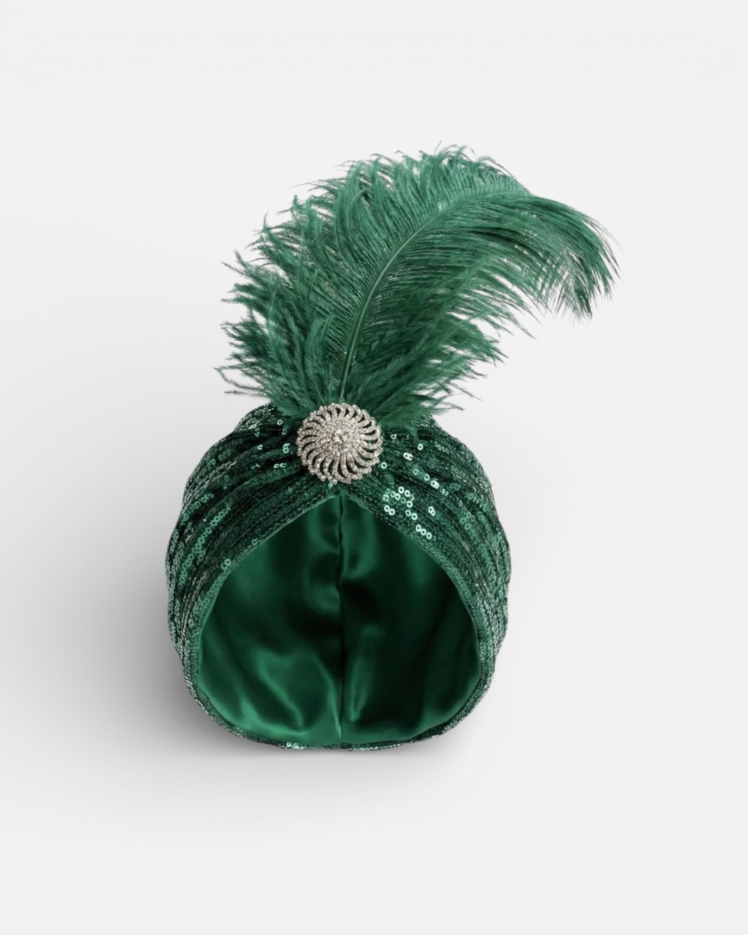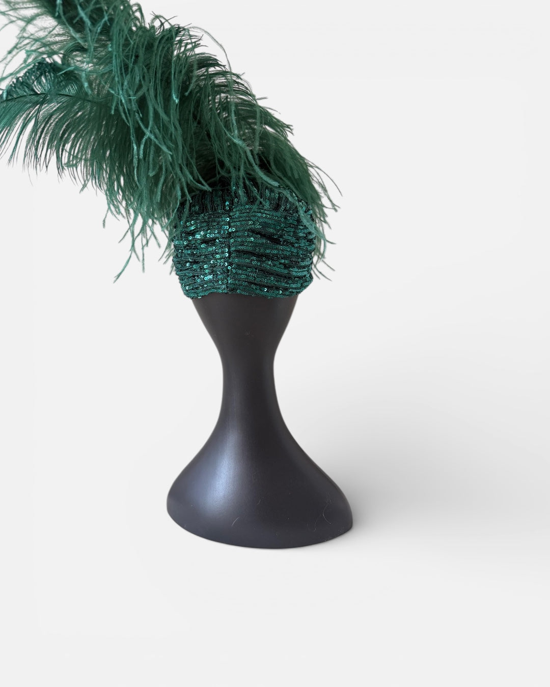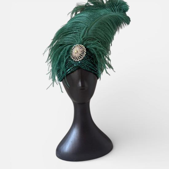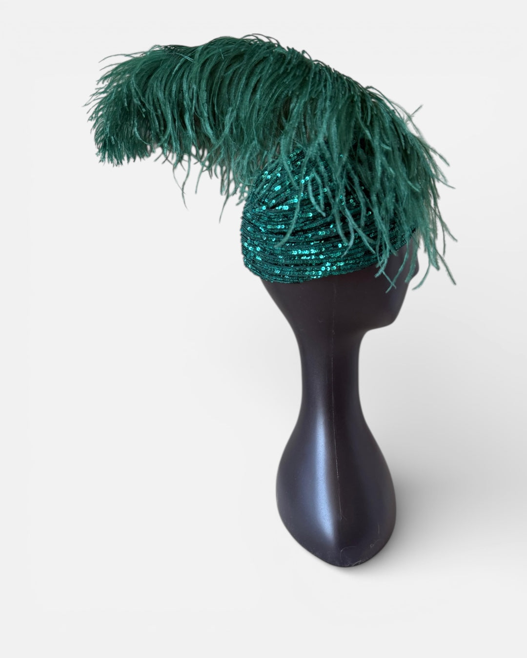 An Alina London exclusive turban crafted in emerald stretch sequinned tulle, sculpted to create a rich, light-catching silhouette. Lined in pure silk for comfort and structure, the design is finished with a dramatic feather plume and a one of a kind vintage brooch, individually sourced and irreplaceable.