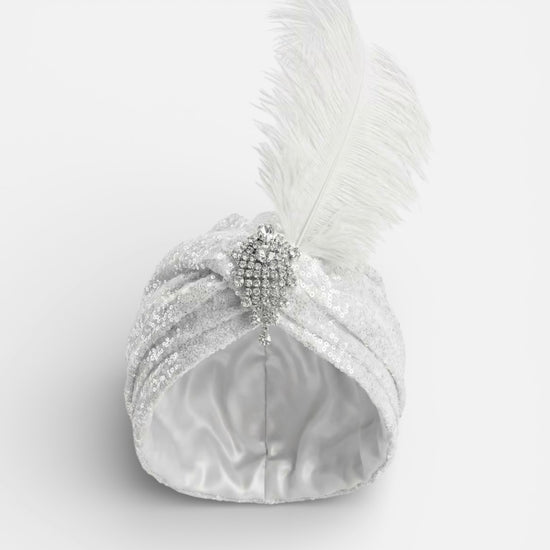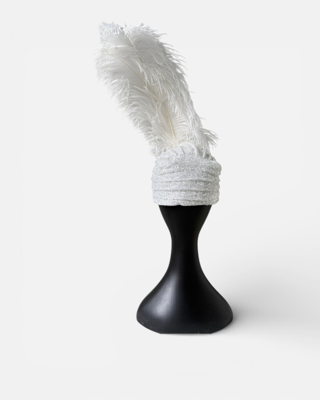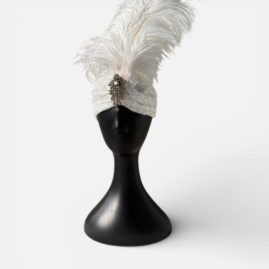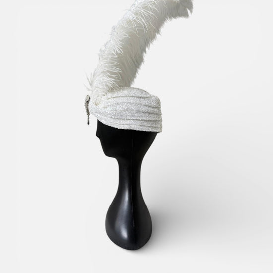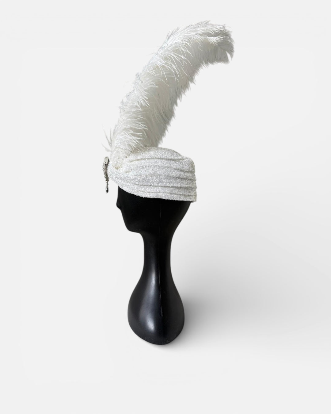 Alina London exclusive turban crafted in softly shimmering ivory fabric, crowned with an elegant ostrich feather plume for sculptural height and movement. Finished with a rare vintage brooch dating from the 1950s, each detail has been individually sourced, making this piece entirely one of a kind. Designed and made in London, this turban exists as a single creation. Once sold, it will not be recreated.