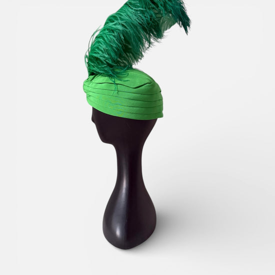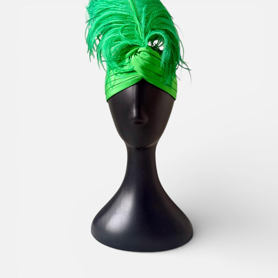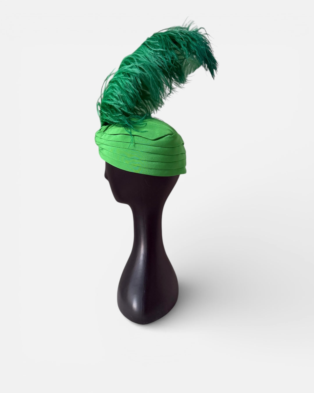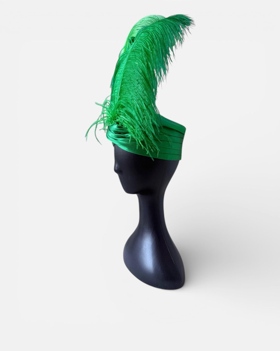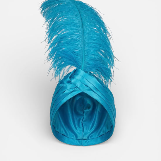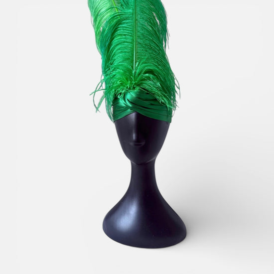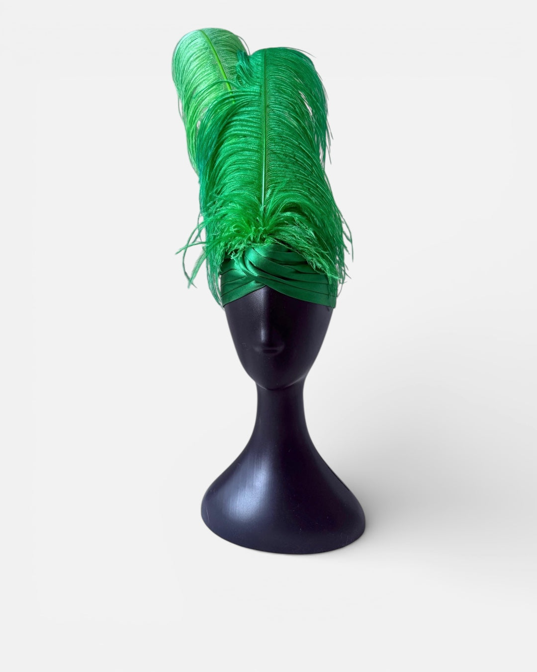 An Alina London statement turban crafted in lustrous silk satin, crowned with a dramatic ostrich feather plume for striking vertical elegance. Created for elevated evening wear, formal occasions, and destination events, this piece embodies theatrical glamour with refined craftsmanship and rare provenance.