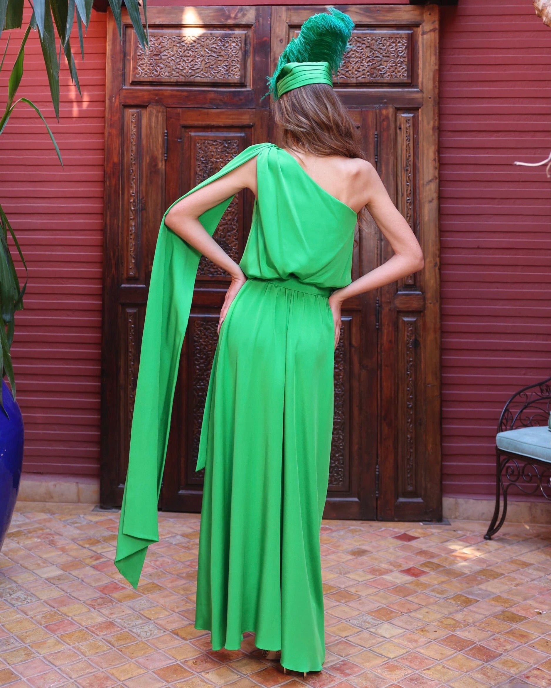 The elegant cascading from the shoulder, waves as you walk. The silk crepe drapes beautifully and the elasticated waist with the tie belt adds an element of additional comfort. The thigh-grazing split shows off a flash of leg with each step you take.