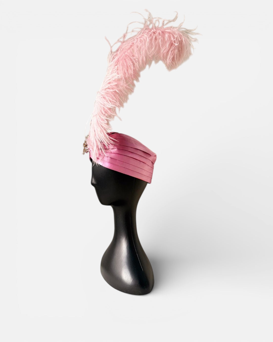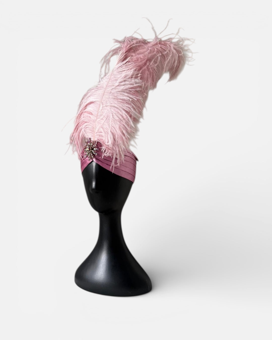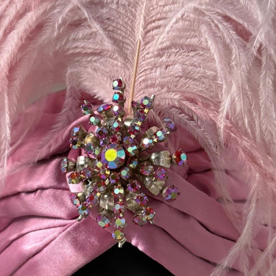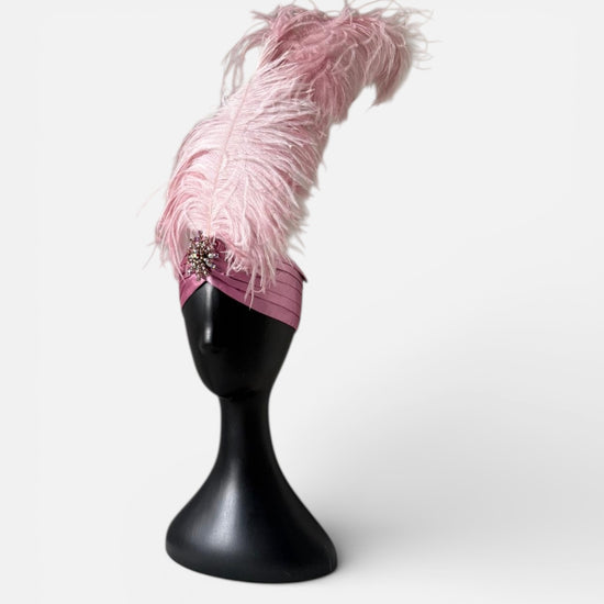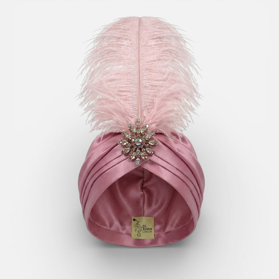 An Alina London exclusive turban crafted in old rose silk satin, finished with a dramatic ostrich feather plume that rises with effortless elegance. The design is completed with a one-of-a-kind vintage brooch, individually sourced and entirely irreplaceable. Designed and made in London, this piece is produced as a singular creation. Once sold, it will not be recreated.
